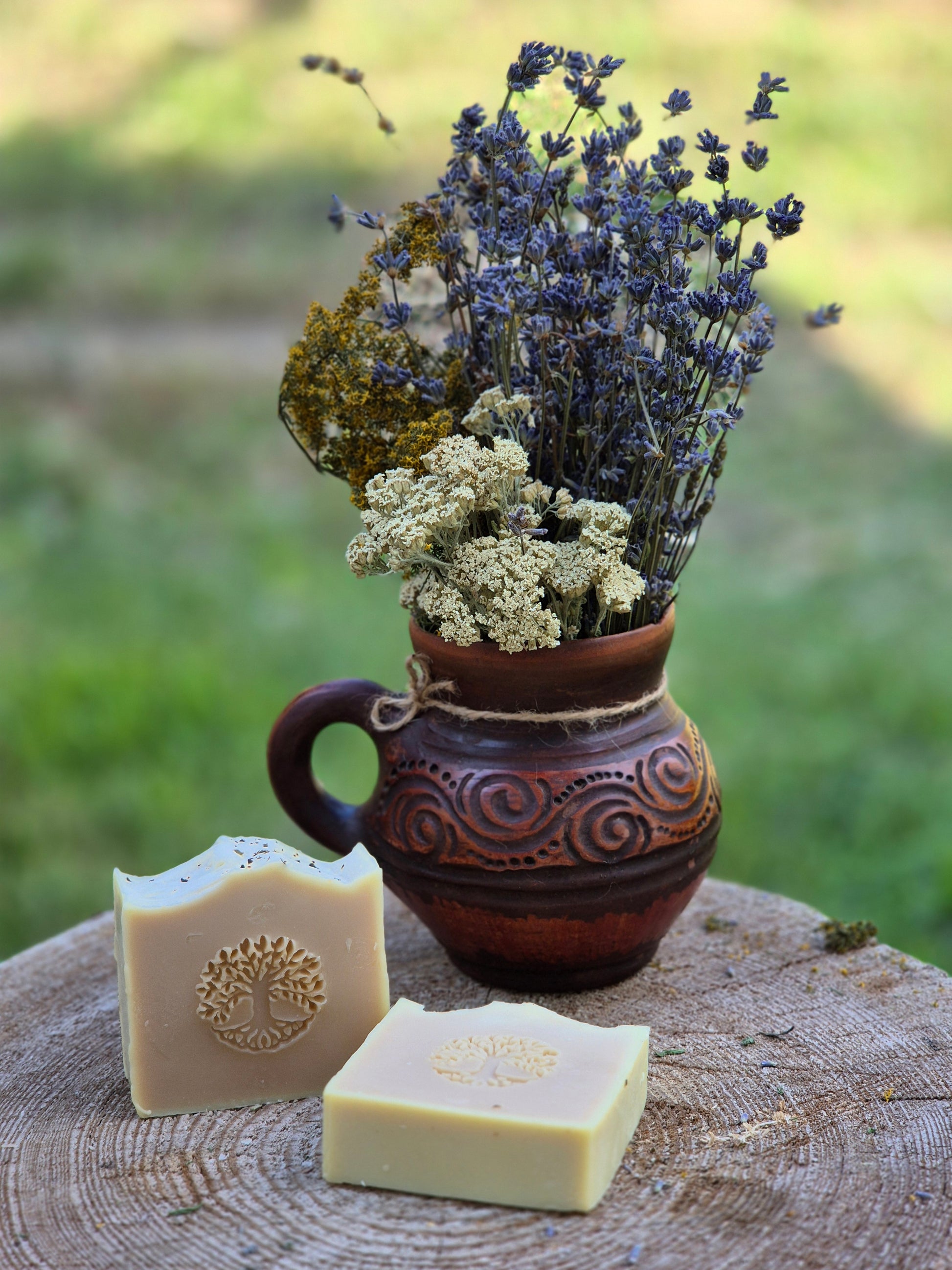 Săpun obținut prin saponificare la rece (cold process) – un procedeu blând care păstrează proprietățile naturale ale plantelor și uleiurilor vegetale.